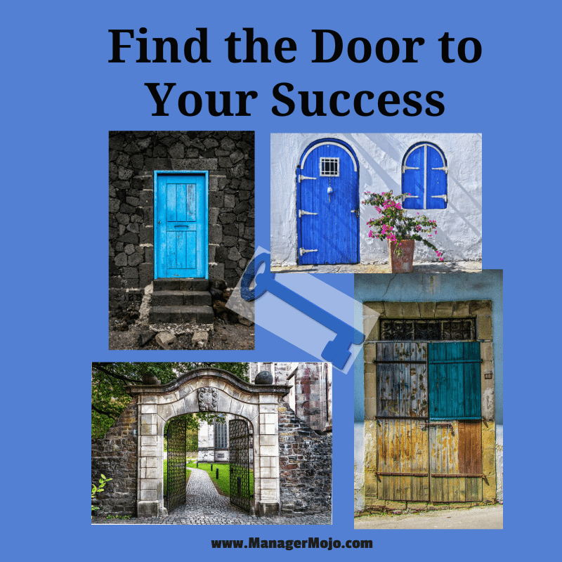 Find the Door to Your Success by Manager Mojo | Oct 11, 2016 | Uncategorized | 0 comments Don’t wait on anyone else to open a door for your success. It’s up to you to find the doors and open them yourself. Of course, there may be a few people along the way helping you to select the doors.