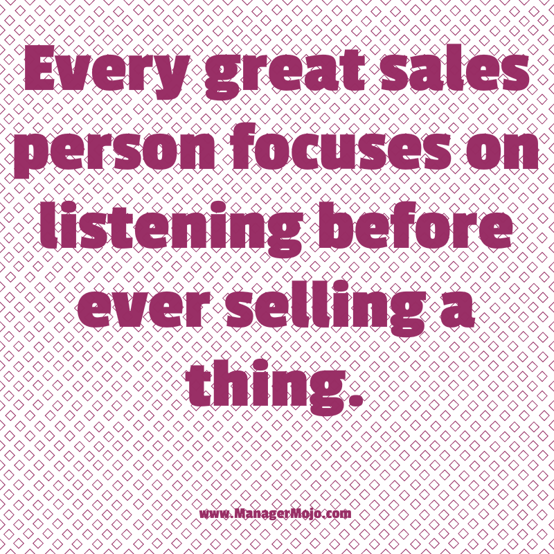 Focus on Listening Before Selling by Manager Mojo | Jun 20, 2016 | Uncategorized | 0 comments When you stop listening you stop selling, at least effectively. You can’t solve your customer’s need if you don’t know what it is.