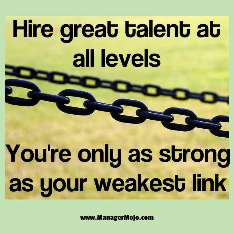 Hire Great Talent by Manager Mojo | Aug 8, 2016 | Uncategorized | 0 comments Be focused on hiring great talent at every level of the company. An organization will only be as successful as its weakest links.