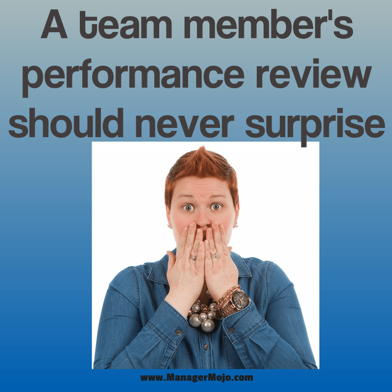 Being a leader isn’t easy. One reason is the meaningful conversations you must have with members of the team. Work with them each step of the way and never surprise them with unknown details at performance review time.