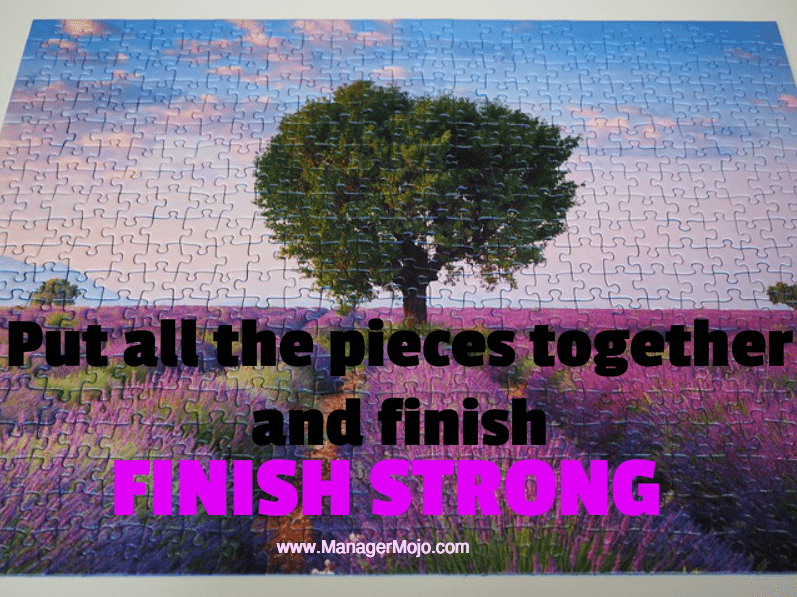 Put the Pieces Together by Manager Mojo | Nov 19, 2015 | Uncategorized | 0 comments Every project, every desire, every year can start things in motion. That’s step #1. What’s most important now is where you are going to finish. FINISH STRONG.